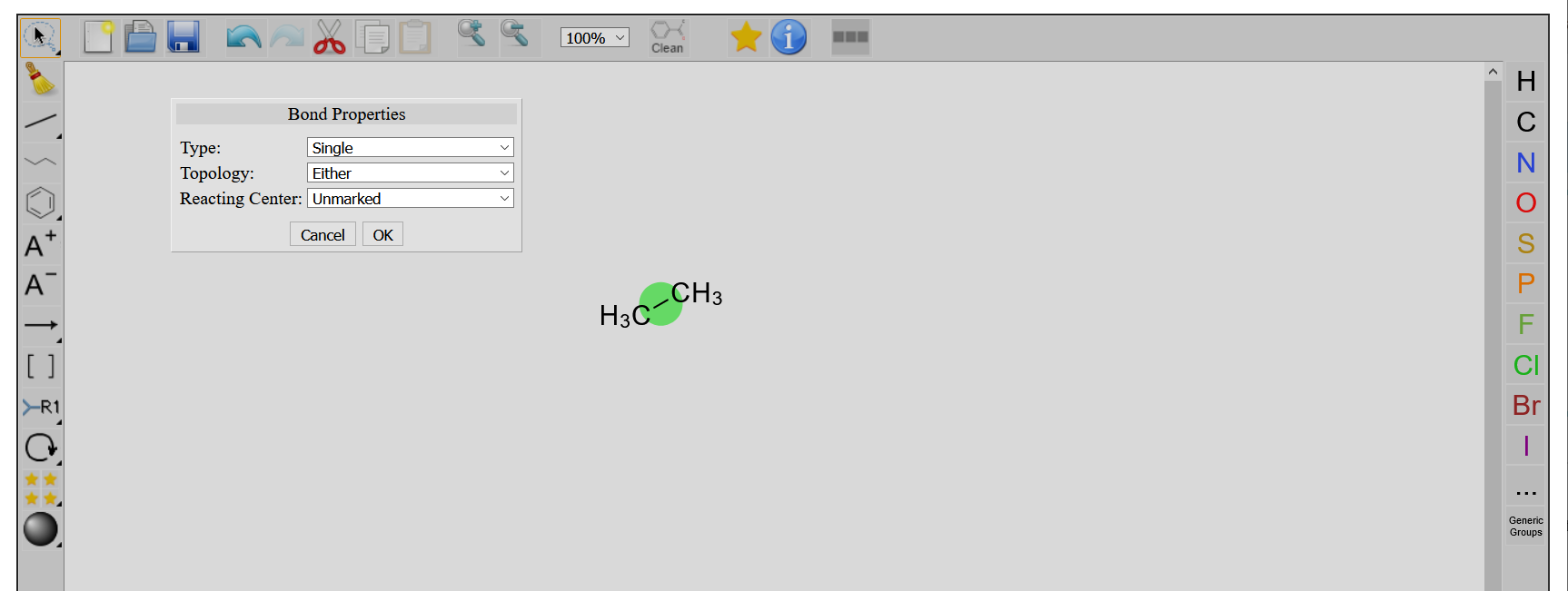 The bonds menu can be usually opened by using this icon from Ketcher's left column. However, if another type of bonds is selected, the main icon changes to that type. Alongside the usual Single, Double, Triple bonds, Ketcher editor offers a variety of bonds to express coordination, stereochemistry, and aromaticity. All bond types can be seen in the image above. If you draw a separate bond (not starting from an atom), it will be assumed to be between two carbon atoms, so with a Single bond you will get CH3-CH3. If it starts from an atom, the end is assumed to be a carbon atom. However those carbon atoms can be replaced with the one you choose from the atoms column. A bond can also be used to connect two atoms or to change the type of an already existing bond to another one. If the bond is asymmetric, e.g. a stereochemical bond, you can change its direction by re-clicking on the bond. Make sure that the right bond type is selected, otherwise you will change the bond type instead of changing its direction.