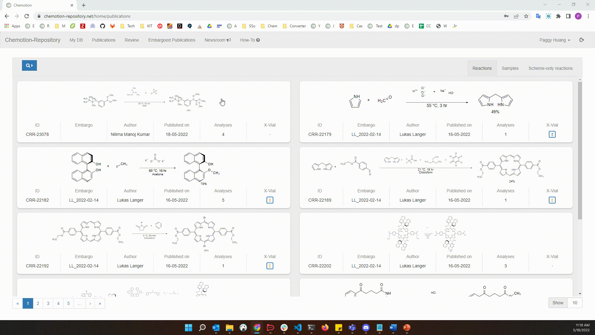 There are different options to find either already published DOIs or the reserved DOIs. The DOIs can be either copied from the single pages of reactions and samples or they can be gained from the embargo bundle page (as a collection DOIs is assigned to each embargo bundle). Please see the different options in the following gifs.
