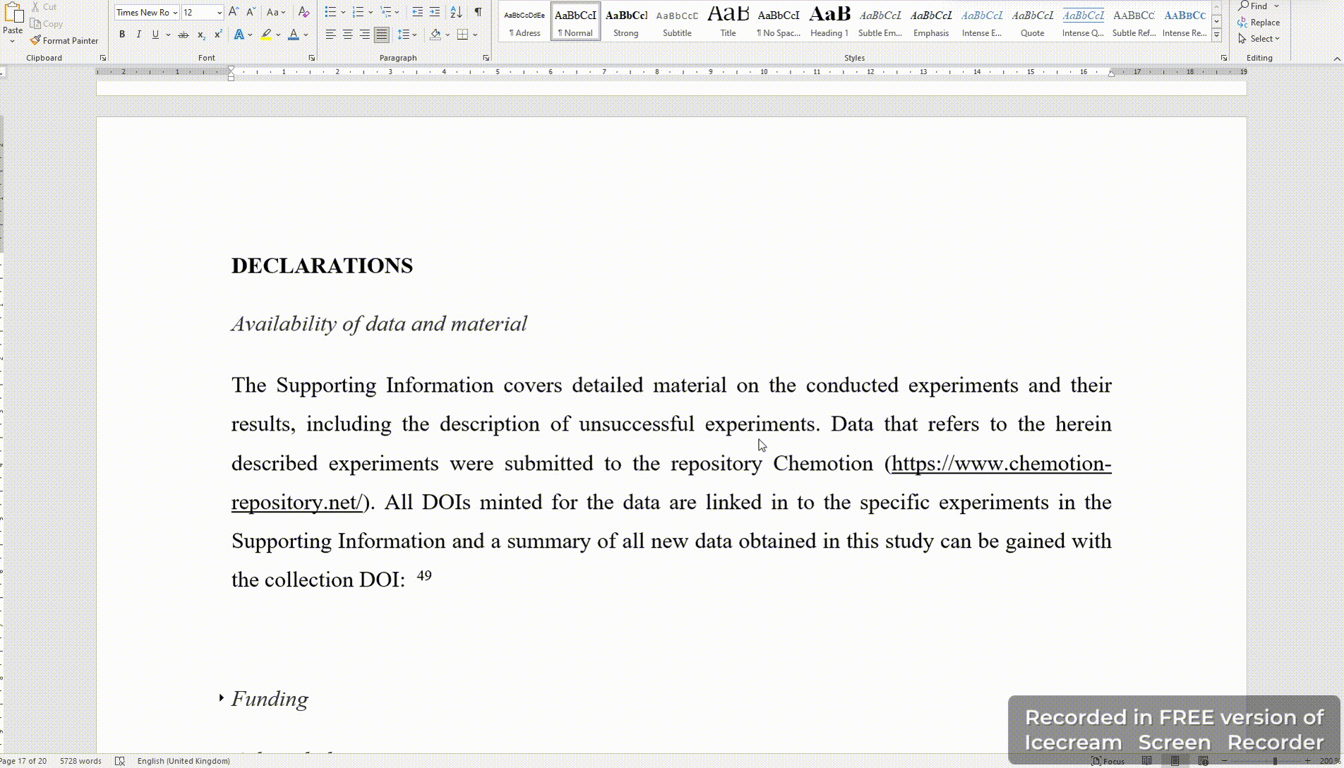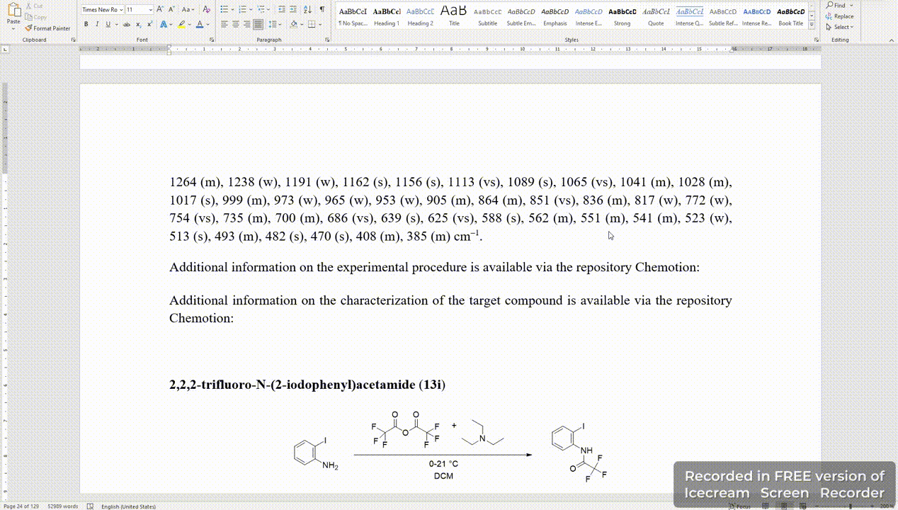 Please add DOIs to your Supporting Information or the experimental/methods part of your main manuscript. Please use at least one DOI per experiment (the reaction DOI), in this case the DOI of the reaction (as the repository then links to samples and their characterization). If possible, please include DOIs for the experiment (the reaction DOI) and the sample (as the repository then links the characterization/analyses). Sometimes it might be helpful to point to specific analyses. Following, you will find an example on how to include reaction DOIs and sample DOIs to a Supplemental Part: