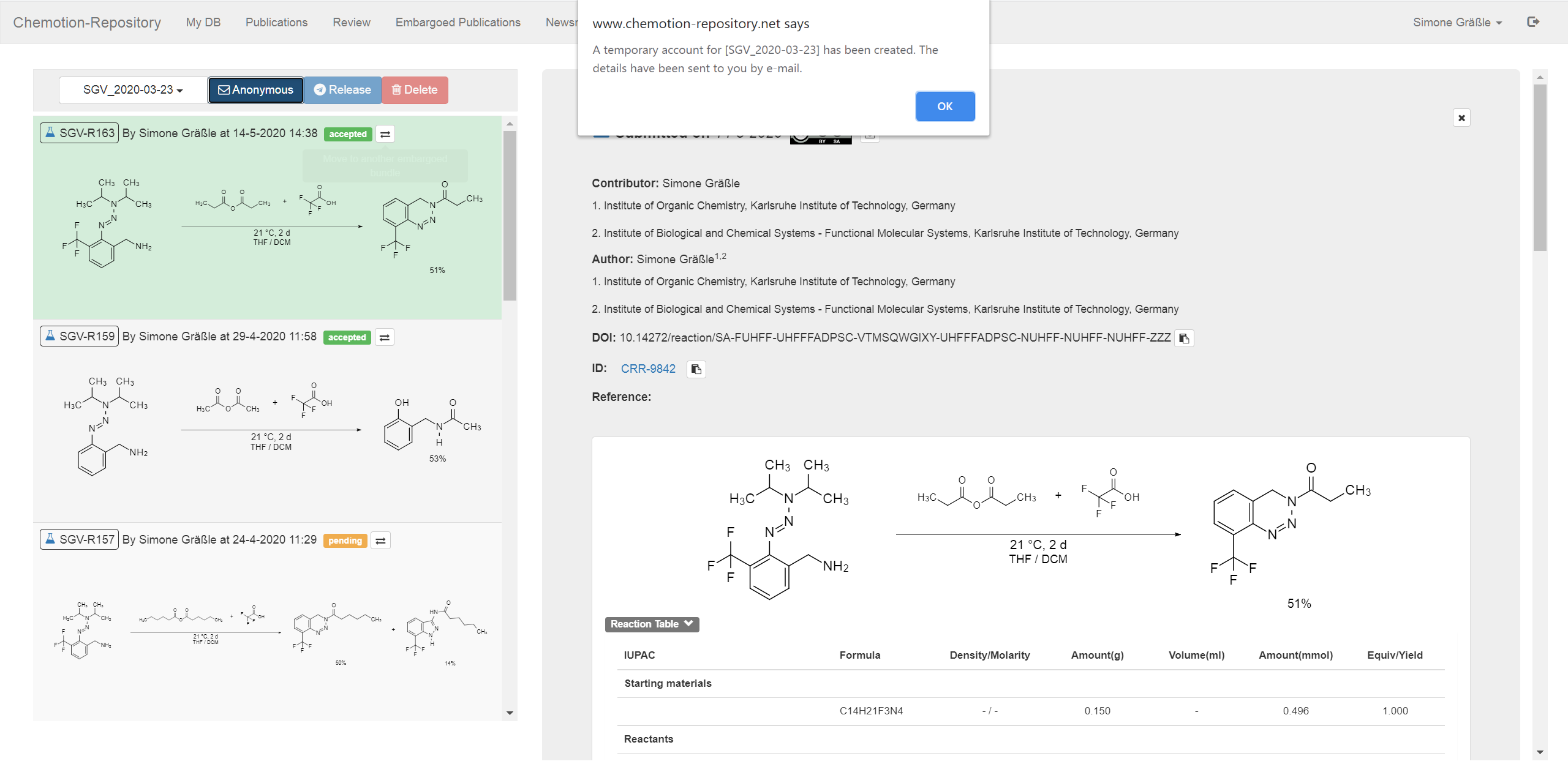 When the embargo is released, a Collection DOI is generated automatically by the system (embargoes released before 10.05.2022 are not included). You can see the Collection DOI link in the reaction/sample details page and through this link you can access to the DOI and metadata for the whole data collection.