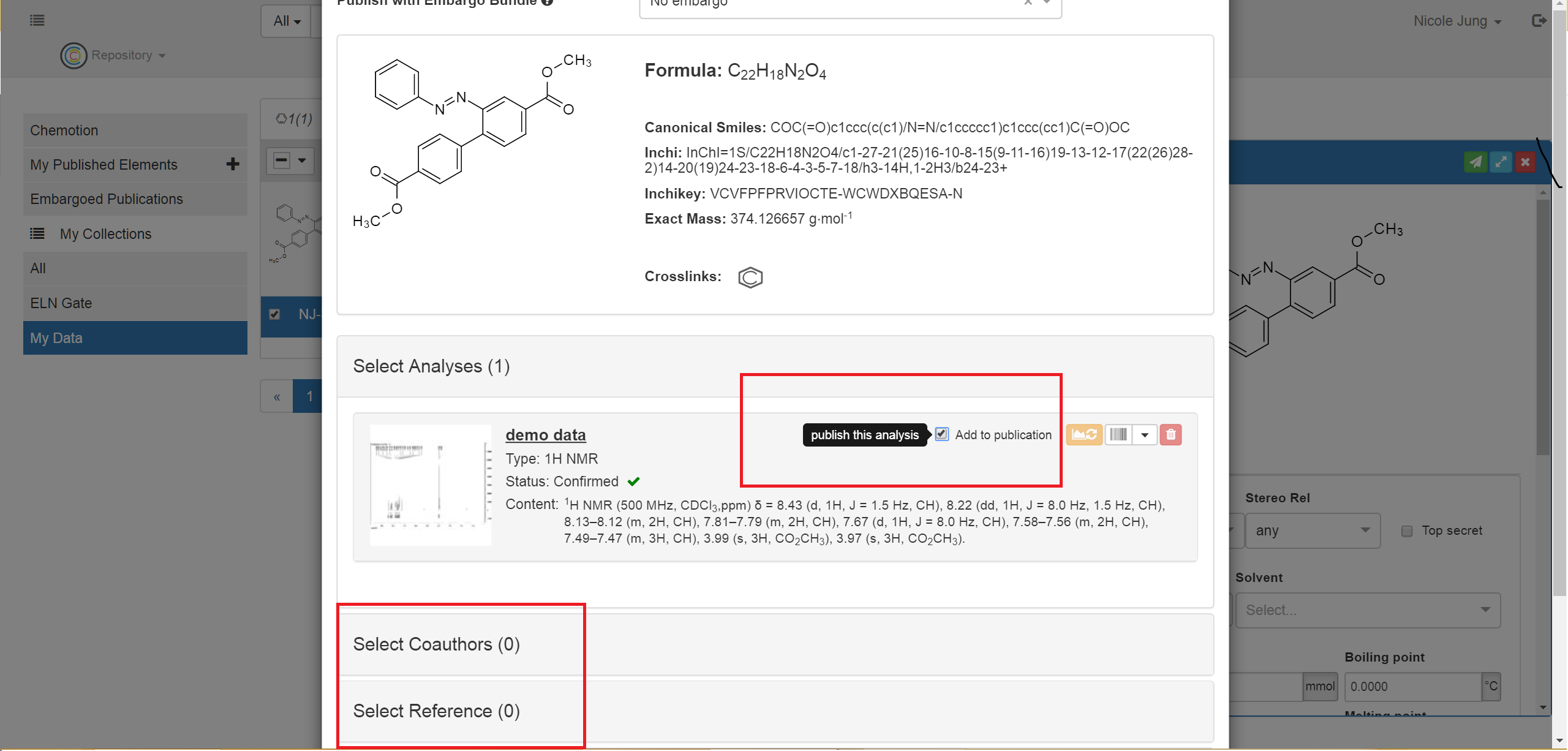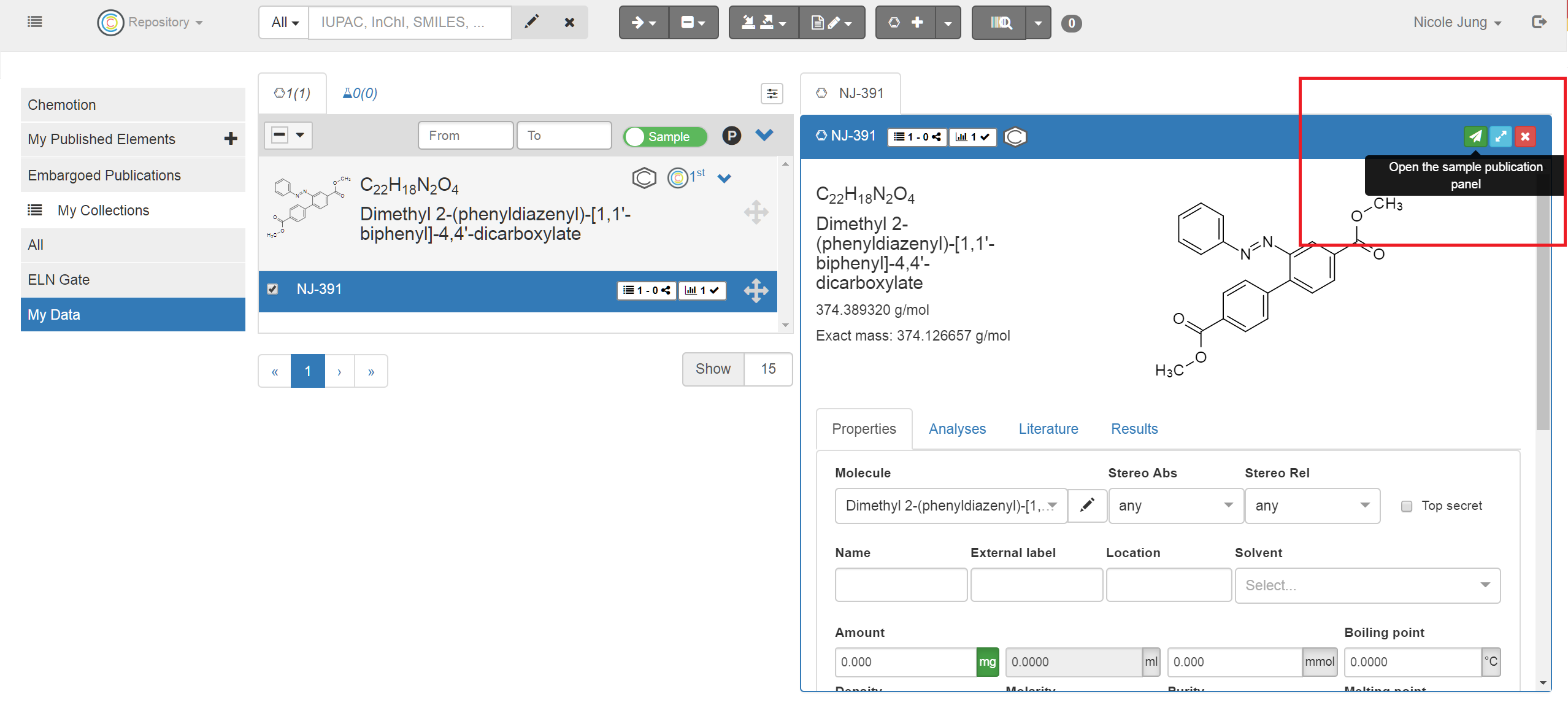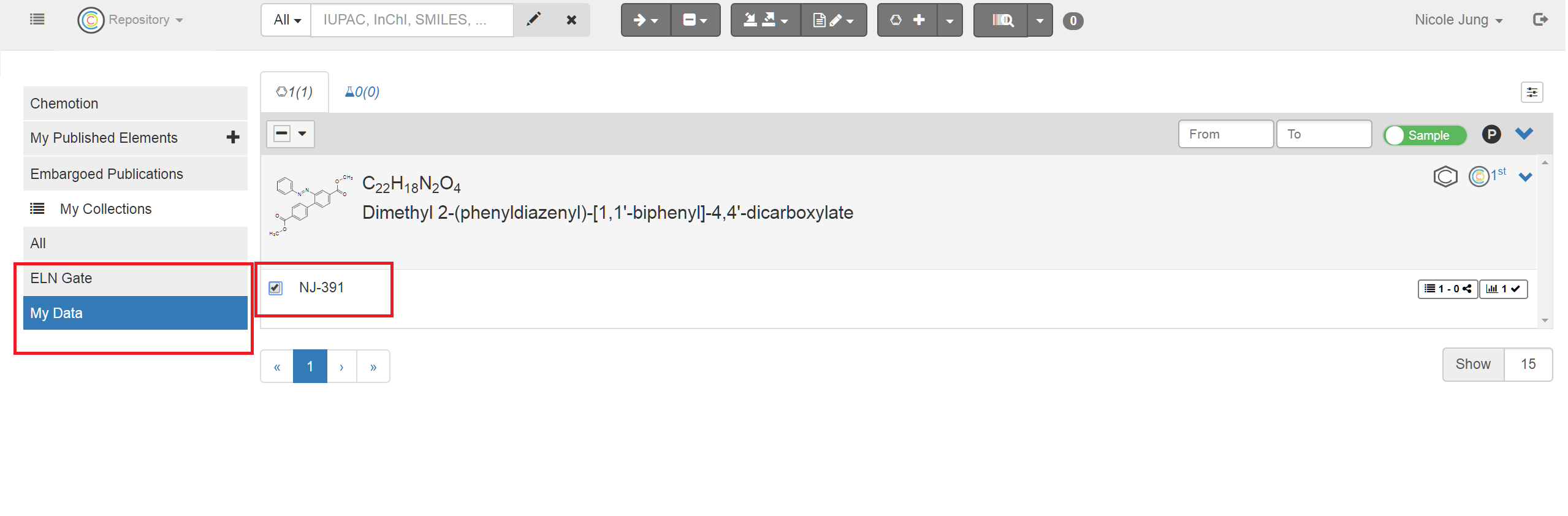 To publish data (disclose data to the public), you have to select data with the selection of the reaction or the molecule the data is assigned to. Select the molecule/reaction in the area “My DB” and use the collections "My Data" or "ELN Gate".